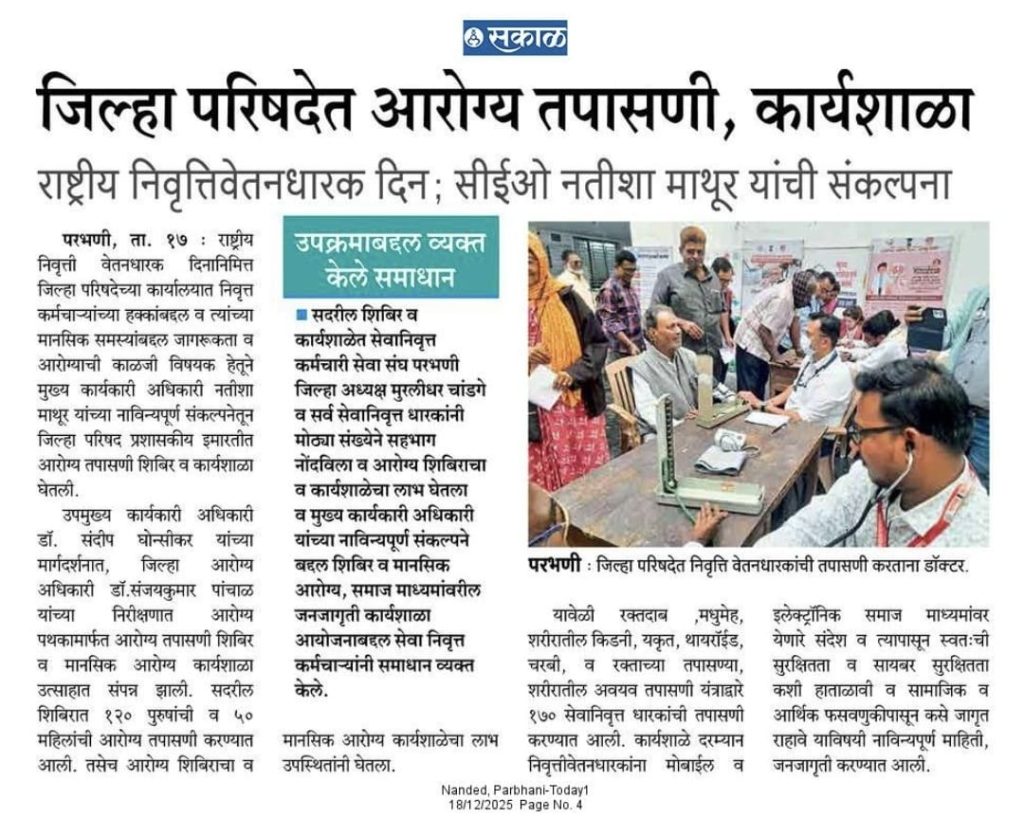 राष्ट्रीय निवृत्तिवेतनधारक दिन-जिल्हा परिषद मधील निवृत्ती वेतन धारक कर्मचाऱ्यांसाठी मा.सीईओ नतिशा माथूर यांच्या मार्गदर्शनात मोफत आरोग्य तपासणी शिबीर
