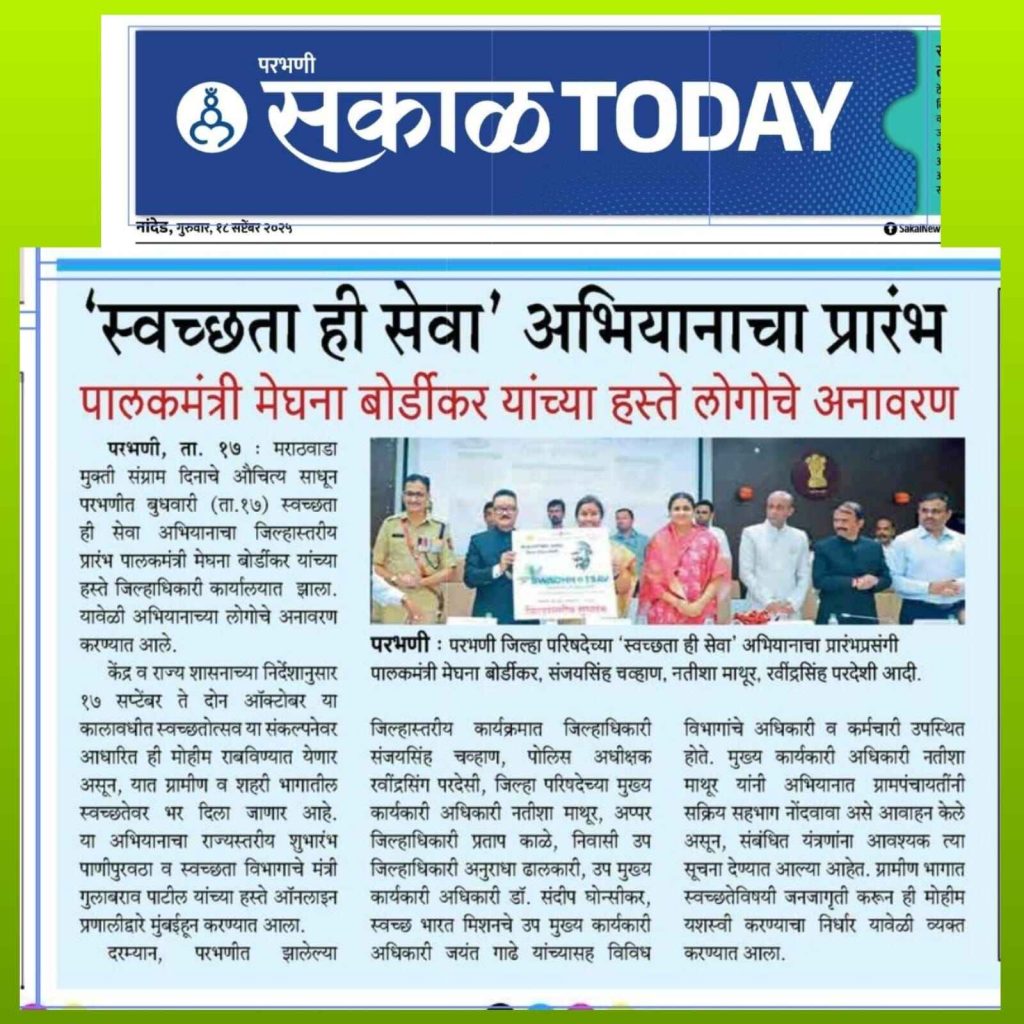 17/09/2025, मराठवाडा मुक्ती संग्राम दिनानिमित्त स्वच्छता ही सेवा अभियानाचा शुभारंभ राज्यमंत्री तथा परभणीच्या पालकमंत्री मेघना दीदी साकोरे-बोर्डीकर यांच्या शुभहस्ते करण्यात आला.